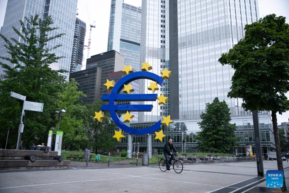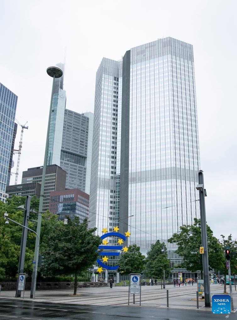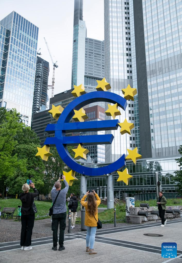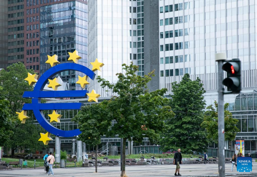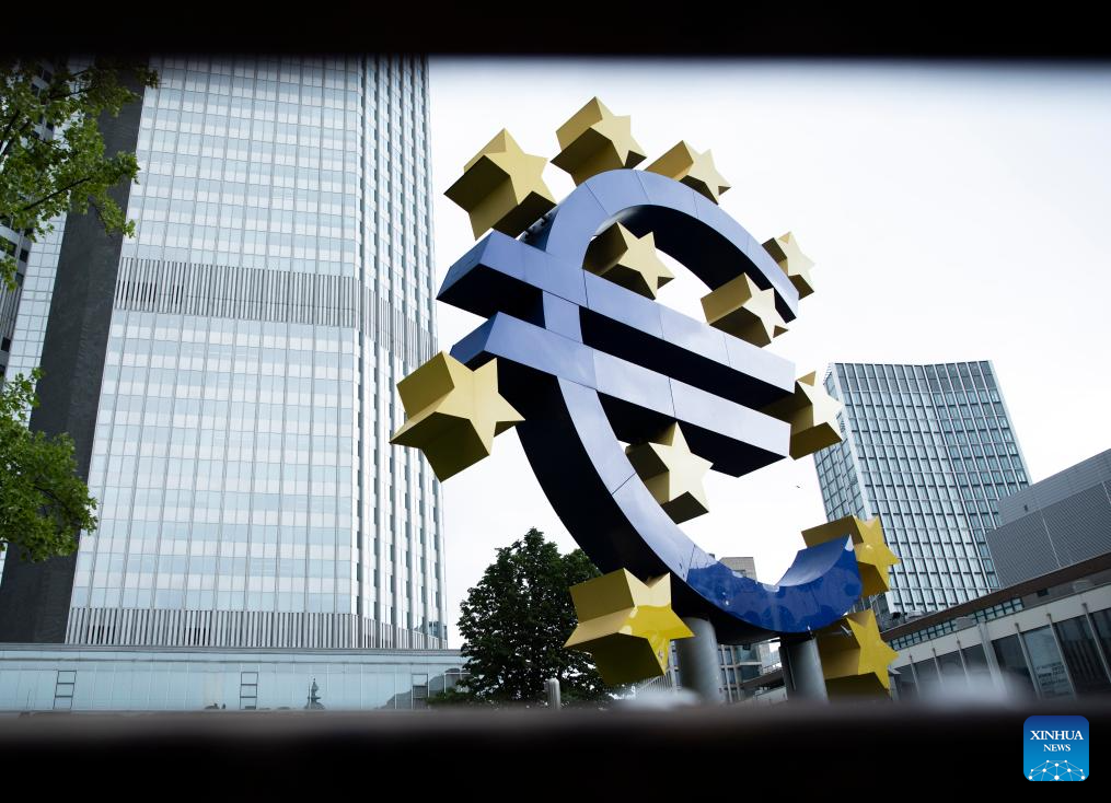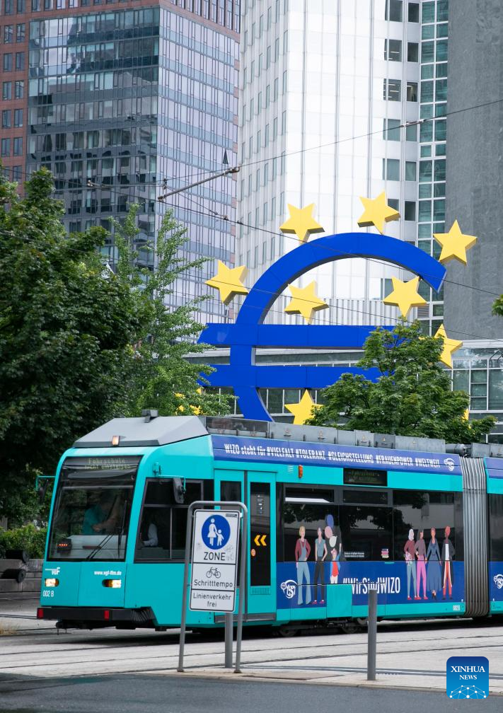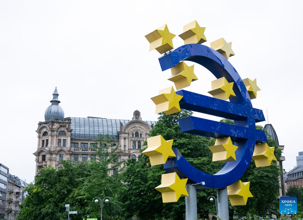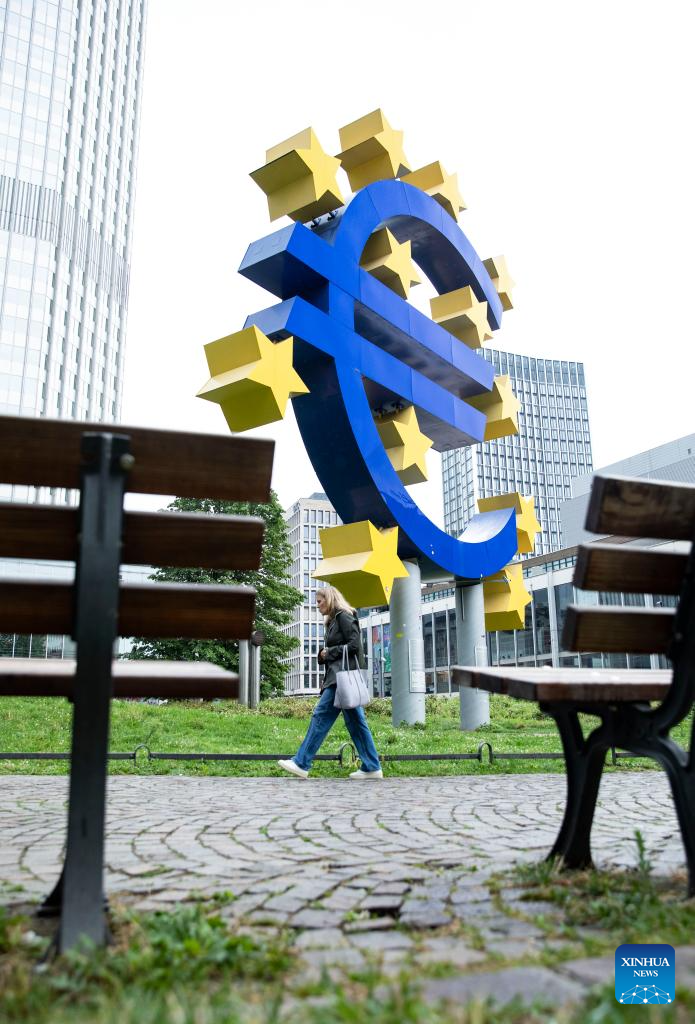 This photo taken on July 27, 2023 shows the Euro sign in Frankfurt, Germany. The European Central Bank (ECB) raised its key interest rates by 25 basis points (bps) on Thursday to curb inflation. (Xinhua/Zhang Fan)