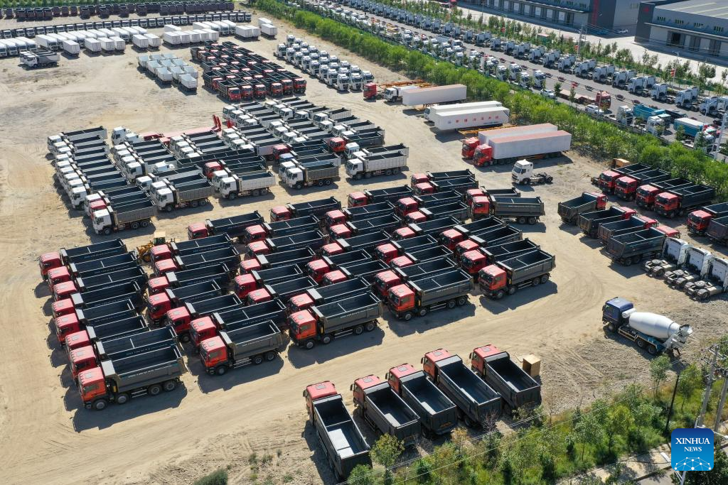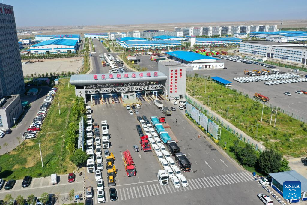 This aerial photo taken on July 26, 2023 shows domestically-made vehicles at the Horgos comprehensive bonded area in northwest China's Xinjiang Uygur Autonomous Region.?(Xinhua/Ding Lei)