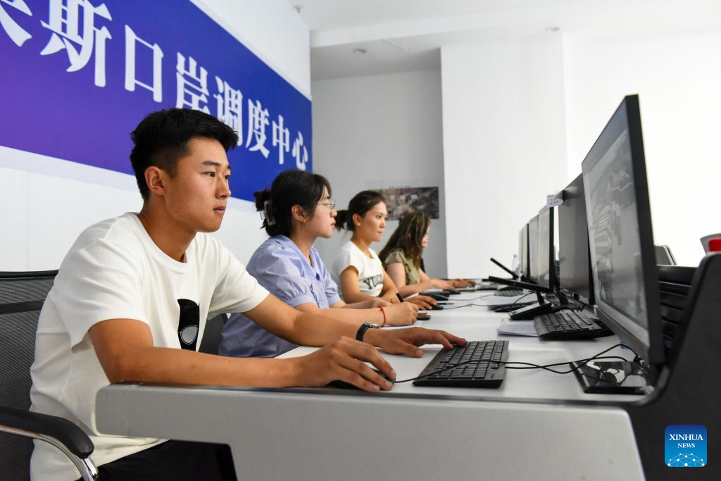 Staff members work at the control center of Horgos Port in northwest China's Xinjiang Uygur Autonomous Region, July 26, 2023.?(Xinhua/Ding Lei)