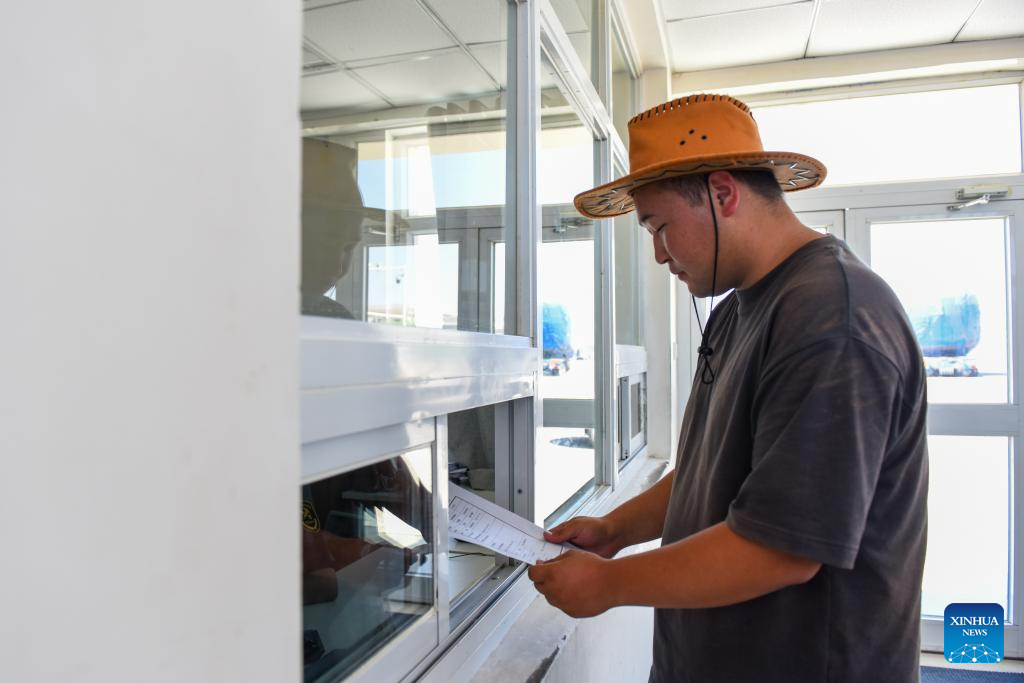 A staff member of an automobile enterprise submits vehicles export application form at the vehicles checkpoint of the Horgos Customs in northwest China's Xinjiang Uygur Autonomous Region, July 26, 2023.?(Xinhua/Ding Lei)