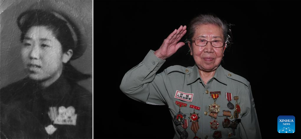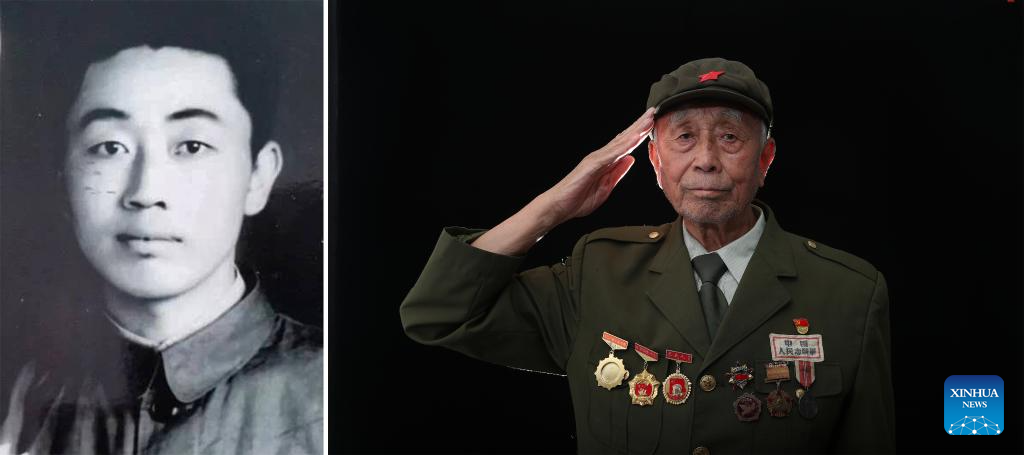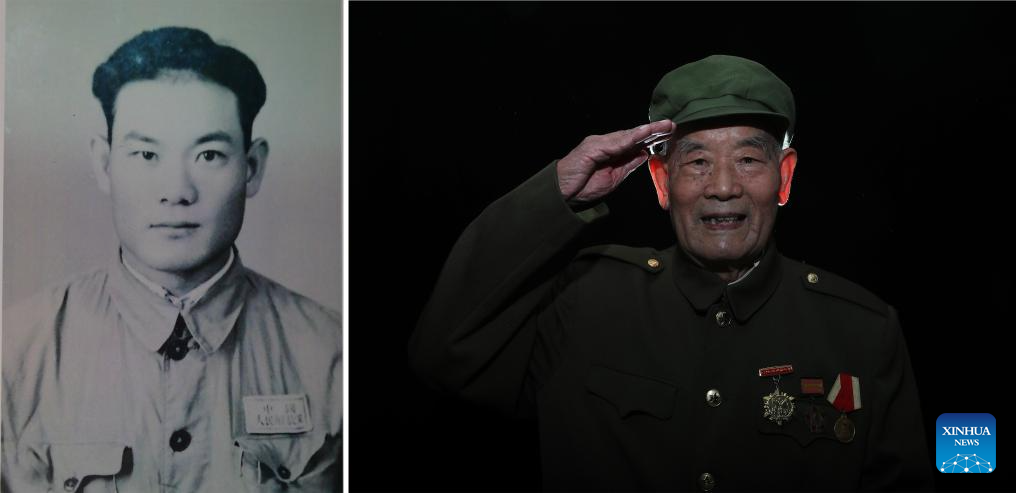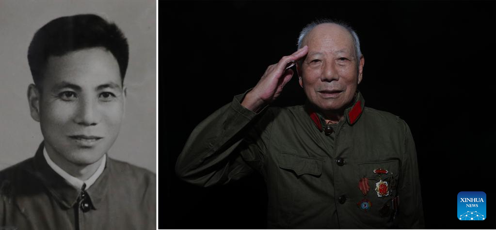 This combo photo shows the portrait of Xiang Fengyu on July 4, 2023. Born in 1933, Xiang participated in the War to Resist U.S. Aggression and Aid Korea in 1951, serving as a communication officer. (Xinhua/Yang Qing)