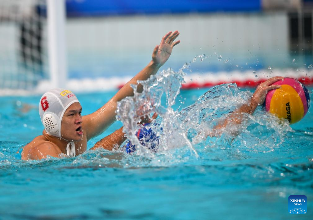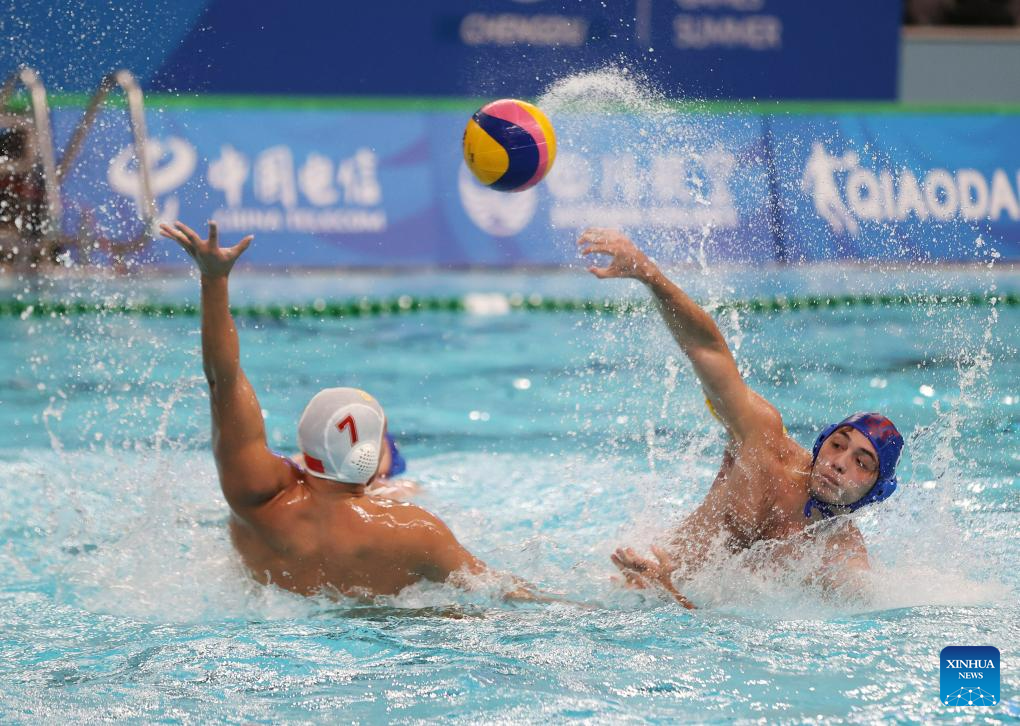 Tan Hengye (L) of China competes during the men's water polo group B match between China and Georgia at the 31st FISU Summer World University Games in Chengdu, southwest China's Sichuan Province, July 27, 2023. (Xinhua/Liu Lei)