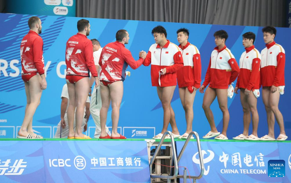 Players of both teams greet each other before the men's water polo group B match between China and Georgia at the 31st FISU Summer World University Games in Chengdu, southwest China's Sichuan Province, July 27, 2023. (Xinhua/Qi Xiaoyi)