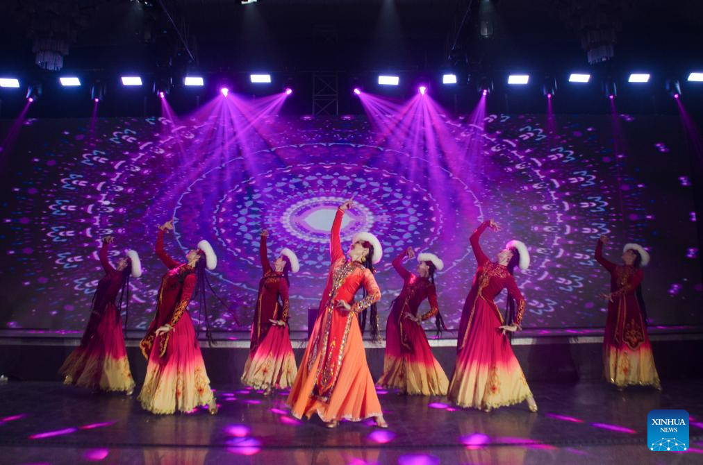 Dancers of China's Xinjiang Art Theater Muqam Art Troupe perform in Bandung, Indonesia, July 27, 2023. The art troupe presented its first performance in Jakarta, capital of Indonesia, on July 19, and will travel to other cities until August 10. (Photo by Septianjar Muharam/Xinhua)