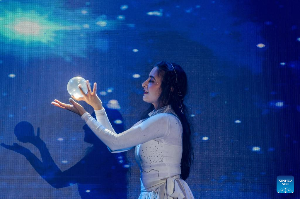 An acrobat of China's Xinjiang Art Theater Muqam Art Troupe performs in Bandung, Indonesia, July 27, 2023. The art troupe presented its first performance in Jakarta, capital of Indonesia, on July 19, and will travel to other cities until August 10. (Photo by Septianjar Muharam/Xinhua)