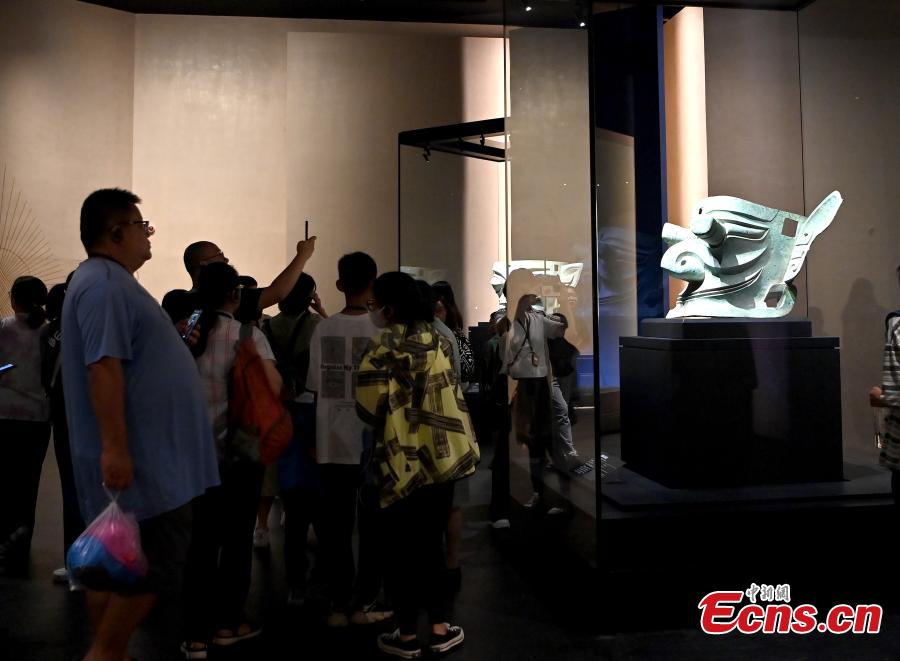 A bronze mask is exhibited at the new building of the Sanxingdui Museum in Guanghan, southwest China's Sichuan Province, July 27, 2023. (Photo: China News Service/An Yuan)