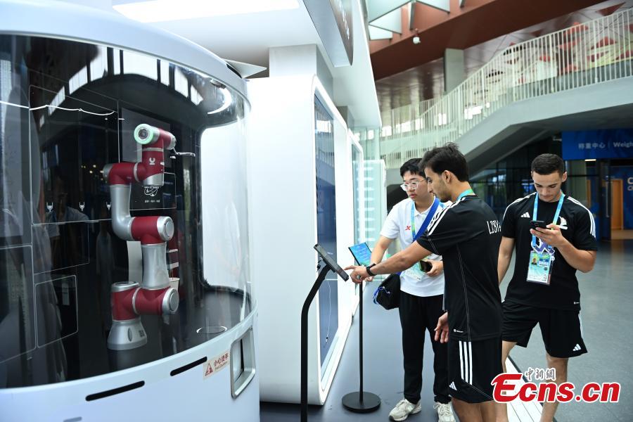 A foreign athlete operates a smart coffee robot at the FISU Games Village in Chengdu, Southwest China's Sichuan Province, July 27, 2023. (Photo: China News Service/Chen Chao)