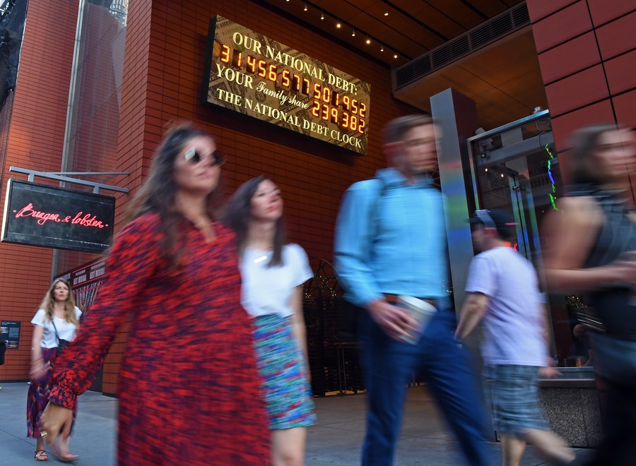 Pedestrians walk past the National Debt Clock in New York, the United States, on June 1, 2023. (Xinhua/Li Rui)