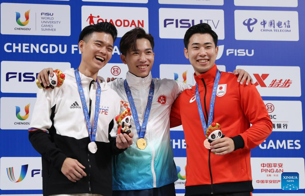 Hui Tak Yan Samuei (C) of China's Hong Kong, Sun Chia-hung (L) of Chinese Taipei and Ebina Tohma of Japan pose during the medal ceremony for the Wushu Men's Taijijian at the 31st FISU Summer World University Games in Chengdu, southwest China's Sichuan Province, July 29, 2023. (Xinhua/Jia Haocheng)