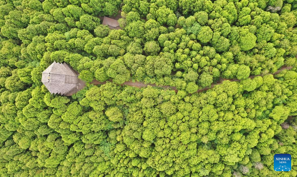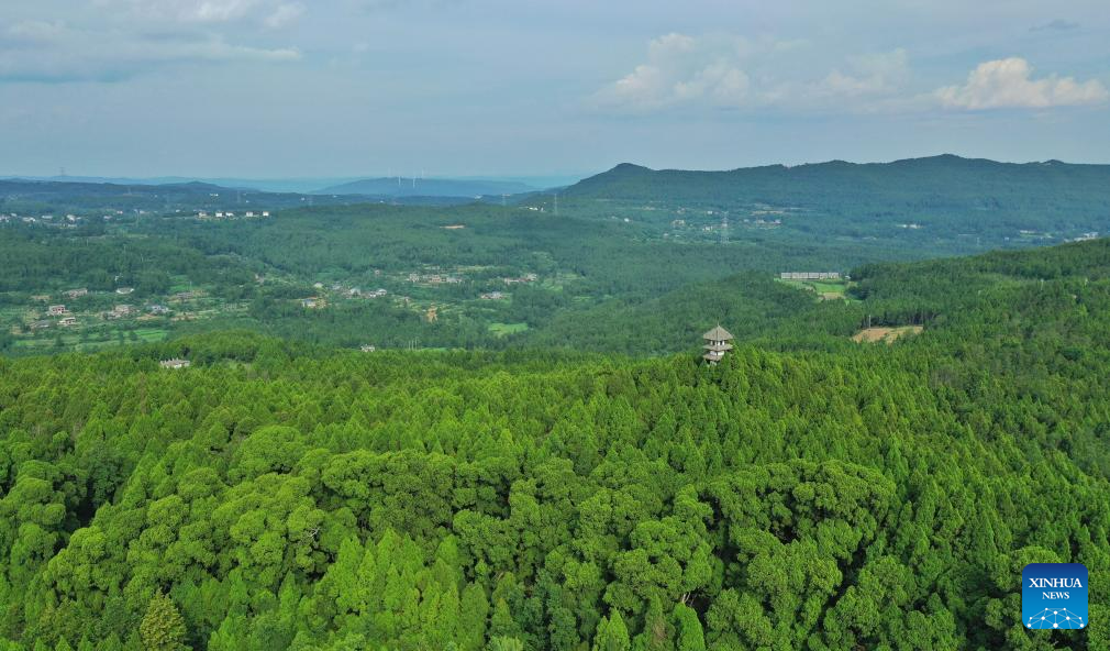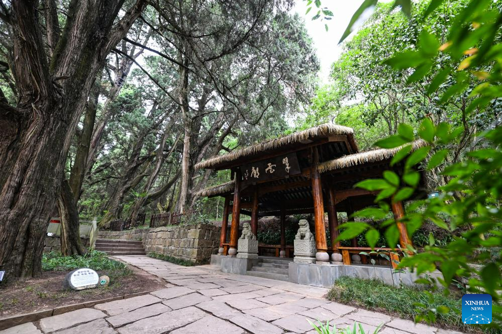 This photo taken on July 24, 2023 shows ancient cypress trees in the Cuiyunlang section of an ancient road system known as "Shudao" in Jiange County of Guangyuan City, southwest China's Sichuan Province. (Xinhua/Wang Xi)