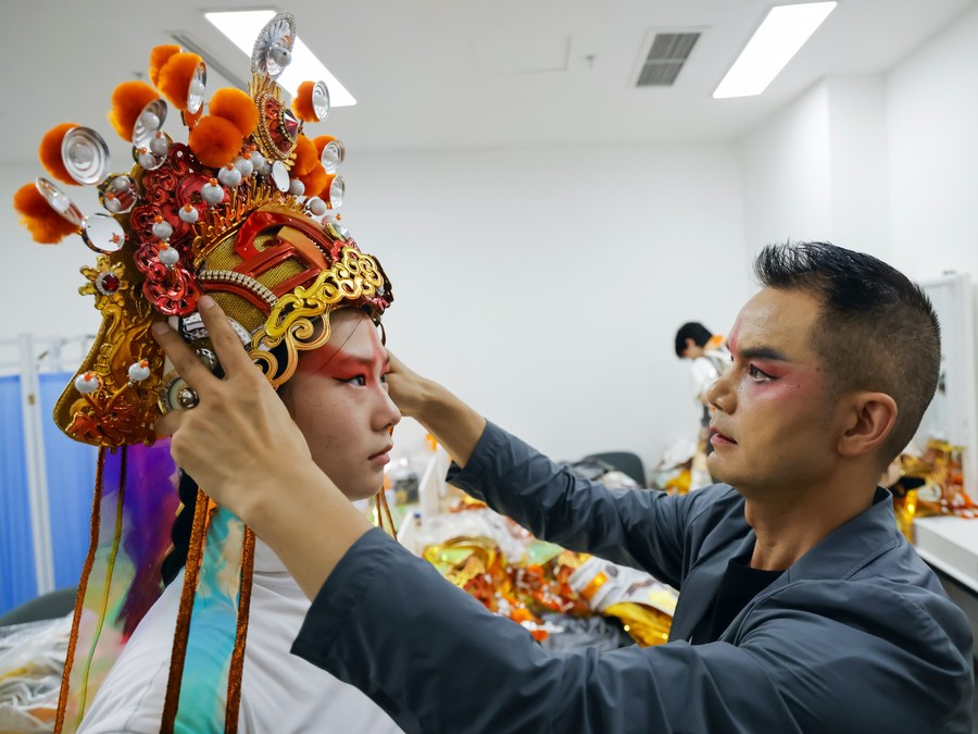 Kang Yong (R), leader as well as director of face-changing performing squad, helps performer Ren Xin with her headwear prior to an opening ceremony rehearsal on July 23, 2023. (Xinhua/Shen Bohan)