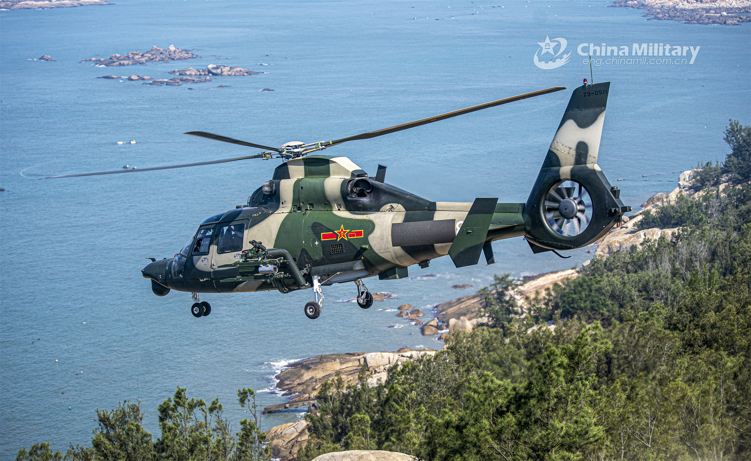 An attack helicopter attached to a brigade under the PLA 71st Group Army flies over a strait during a flight training exercise in late July, 2023. (eng.chinamil.com.cn/Photo by Xiang Xu)