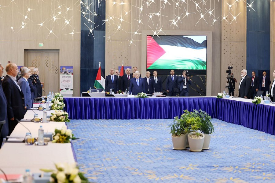 Photo taken on July 30, 2023, shows the scene of the reconciliation meeting of heads of Palestinian factions held in New Alamein City, Egypt. (Palestinian Embassy in Egypt/Handout via Xinhua)