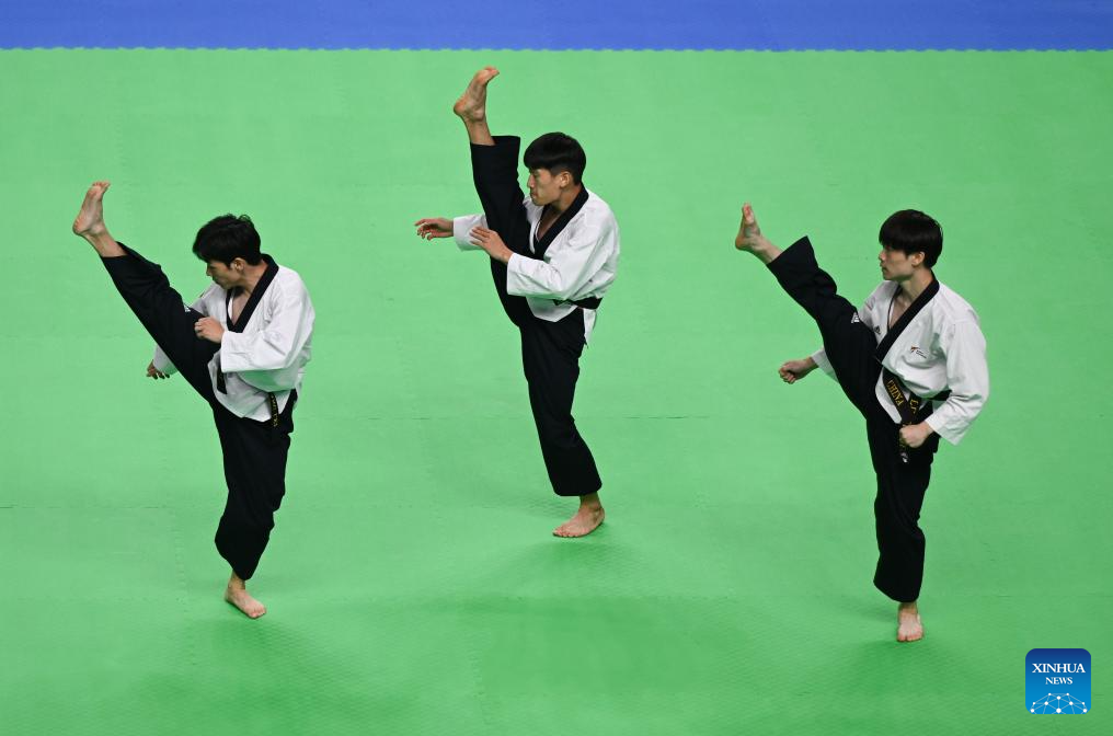 Hu Mingda (C), Yang Lei (R) and Liu Siyue of China compete during the final of men's Team Poomsae of Taekwondo at the 31st FISU Summer World University Games in Chengdu, southwest China's Sichuan Province, July 30, 2023. (Xinhua/Liu Lei)