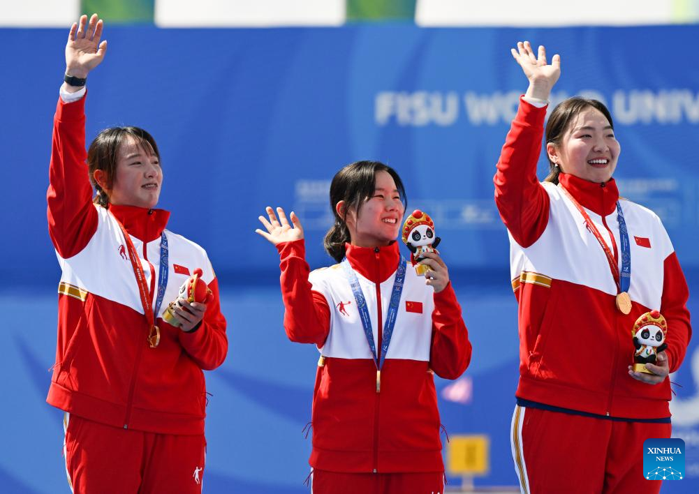 Team China celebrate during the awarding ceremony for the Archery Recurve Women's Team at the 31st FISU Summer World University Games in Chengdu, southwest China's Sichuan Province, July 30, 2023. (Xinhua/Deng Hua)