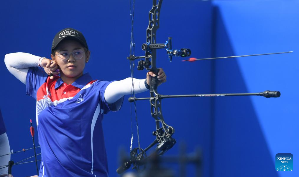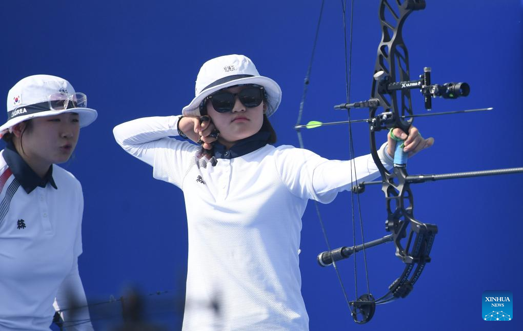 Han Seungyeon of South Korea competes during the Archery Compound Women's Team Gold Medal Match between South Korea and India at the 31st FISU Summer World University Games in Chengdu, southwest China's Sichuan Province, July 30, 2023. (Xinhua/Deng Hua)