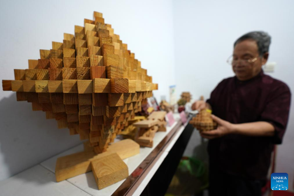 Craftsman Hou Quanchen shows how to reassemble a Kong Ming Lock at home in Shahe City, north China's Hebei Province, July 30, 2023. (Xinhua/Mu Yu)