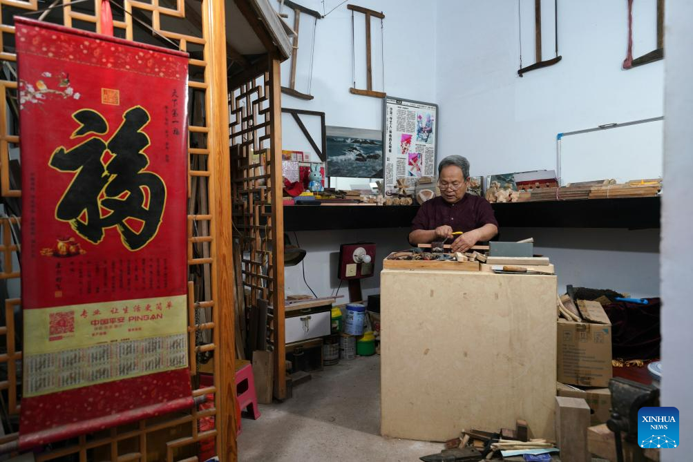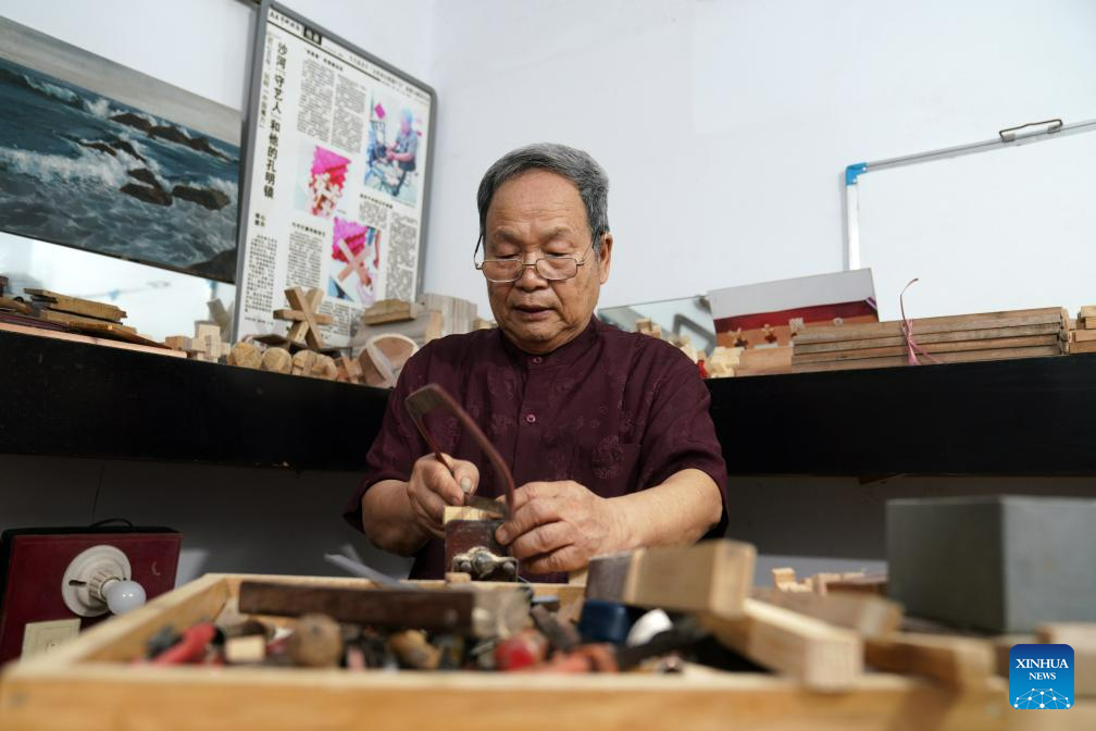Craftsman Hou Quanchen makes a Kong Ming Lock at a workshop in Shahe City, north China's Hebei Province, July 30, 2023.?(Xinhua/Mu Yu)