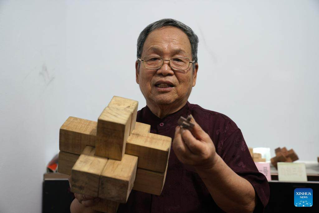 Hou, 79, has devoted himself for six decades to making Kong Ming Lock, a traditional Chinese folk educational toy. In his leisure hours, Hou also promotes the intellectual toy among school students.