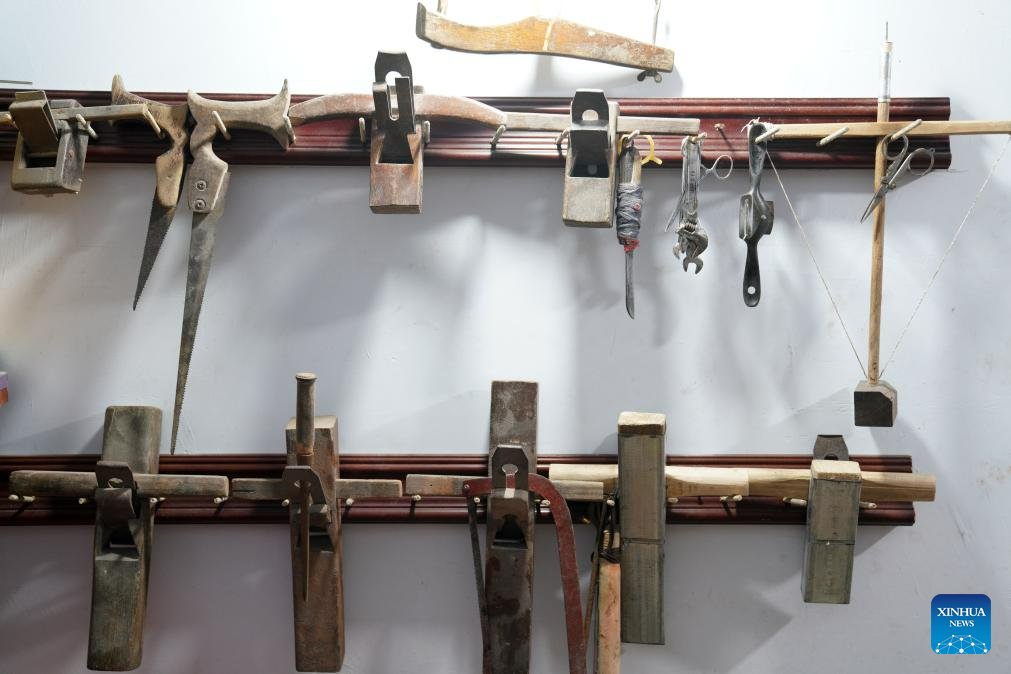 This photo taken on July 30, 2023 shows the tools that craftsman Hou Quanchen uses to make Kong Ming Lock in Shahe City, north China's Hebei Province.?(Xinhua/Mu Yu)
