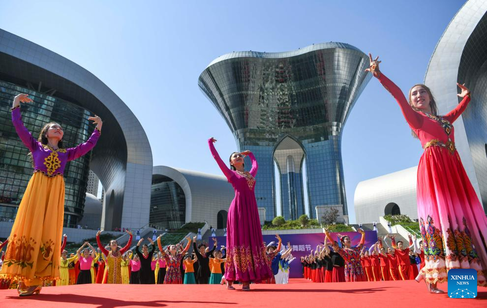 Dancers perform at a square in Urumqi, northwest China's Xinjiang Uygur Autonomous Region, on July 27, 2023.?(Xinhua/Hu Huhu)