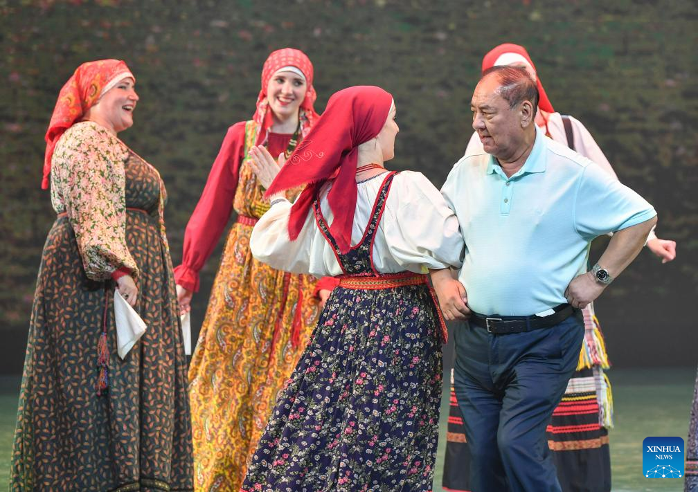 Dancers from Russia's Saratov Oblast dance with an audience at a theater in Urumqi, northwest China's Xinjiang Uygur Autonomous Region, July 22, 2023.?(Xinhua/Hu Huhu)