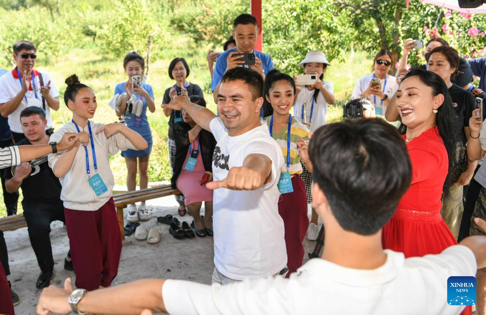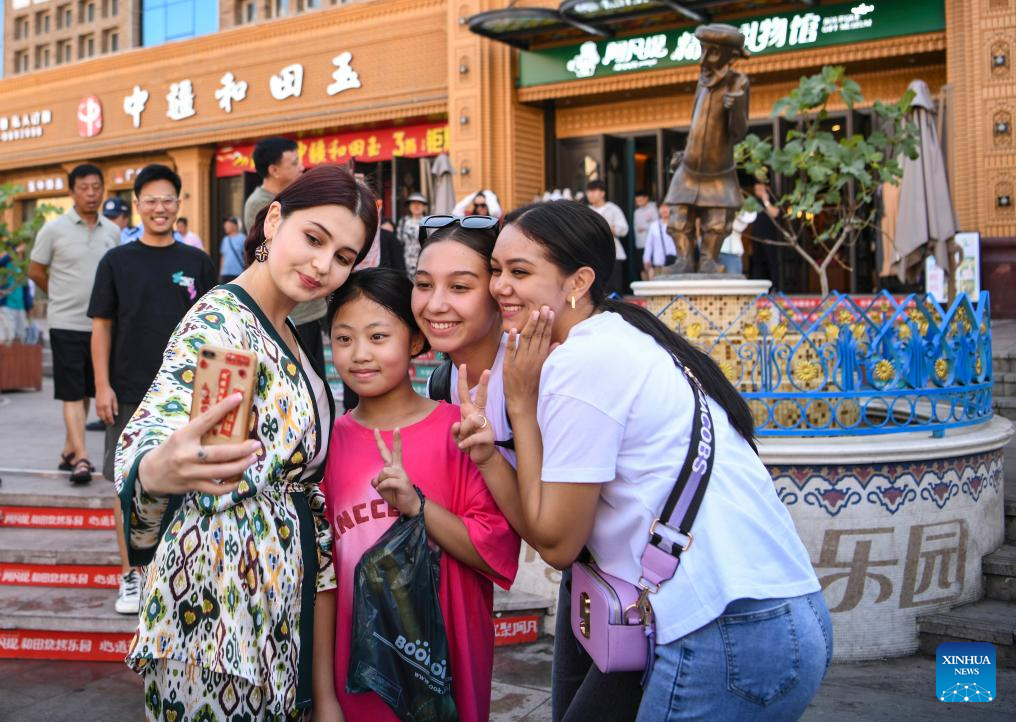Three dancers from Uzbekistan take a selfie with a tourist (2nd L, front) at the International Grand Bazaar in Urumqi, northwest China's Xinjiang Uygur Autonomous Region, July 25, 2023.?(Xinhua/Hu Huhu)