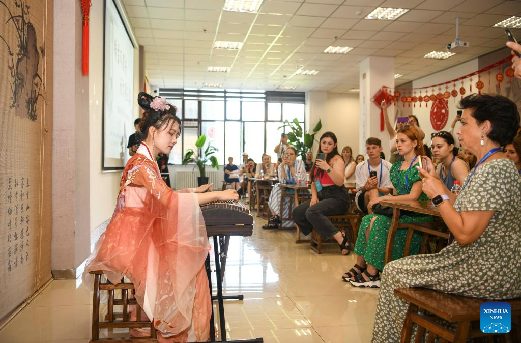 Foreign dance troupe members watch a performance of guzheng, a Chinese zither, at the Xinjiang Library in Urumqi, northwest China's Xinjiang Uygur Autonomous Region, on July 23, 2023.?(Xinhua/Hu Huhu)