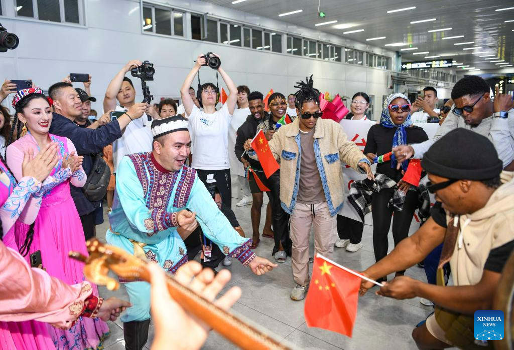Members of the Muqam Art Troupe of Xinjiang Art Theater dance to welcome a South African dance troupe at the Urumqi Diwopu International Airport in Urumqi, northwest China's Xinjiang Uygur Autonomous Region, July 24, 2023. (Xinhua/Hu Huhu)