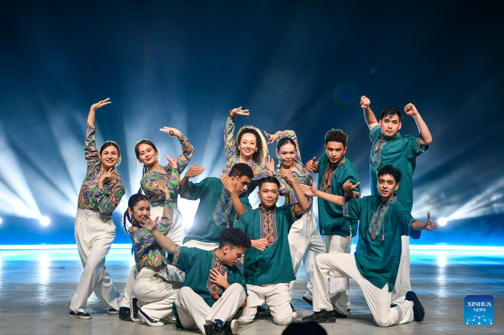Dance troupe members from the Bunditpatanasilpa Institute of Thailand and members of the Muqam Art Troupe of Xinjiang Art Theater dance together at the Xinjiang Art Theater in Urumqi, northwest China's Xinjiang Uygur Autonomous Region, July 24, 2023.?(Xinhua/Hu Huhu)