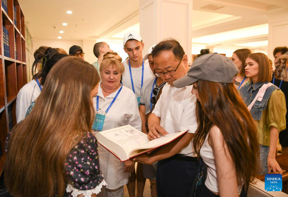 A staff member (2nd R, front) introduces the Yongle Canon, the world's earliest and biggest encyclopedia compiled in the early 1400s, to foreign dance troupe members visiting the Xinjiang Library in Urumqi, northwest China's Xinjiang Uygur Autonomous Region, on July 23, 2023.?(Xinhua/Hu Huhu)