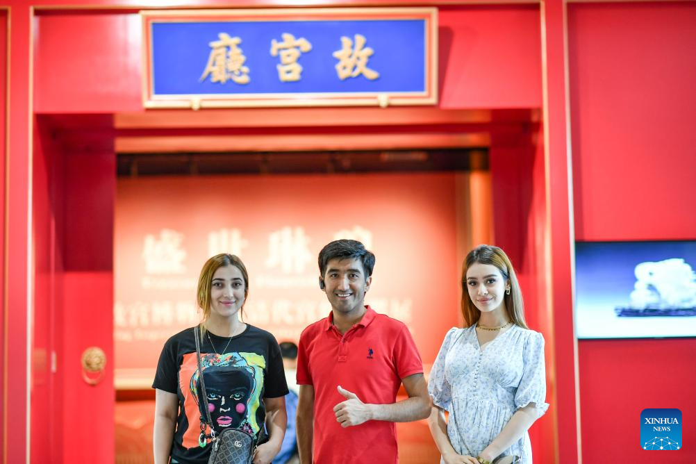 Three Tajik dancers pose for photos at Xinjiang Museum in Urumqi, northwest China's Xinjiang Uygur Autonomous Region, on July 29, 2023.?(Xinhua/Hu Huhu)