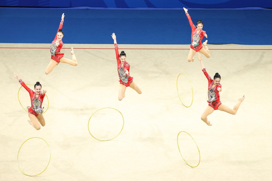 Athletes of China compete in the rhythmic gymnastics group 5 hoops at the 31st FISU Summer World University Games in Chengdu, southwest China's Sichuan Province, July 31, 2023. (Xinhua/Zhang Liyun)