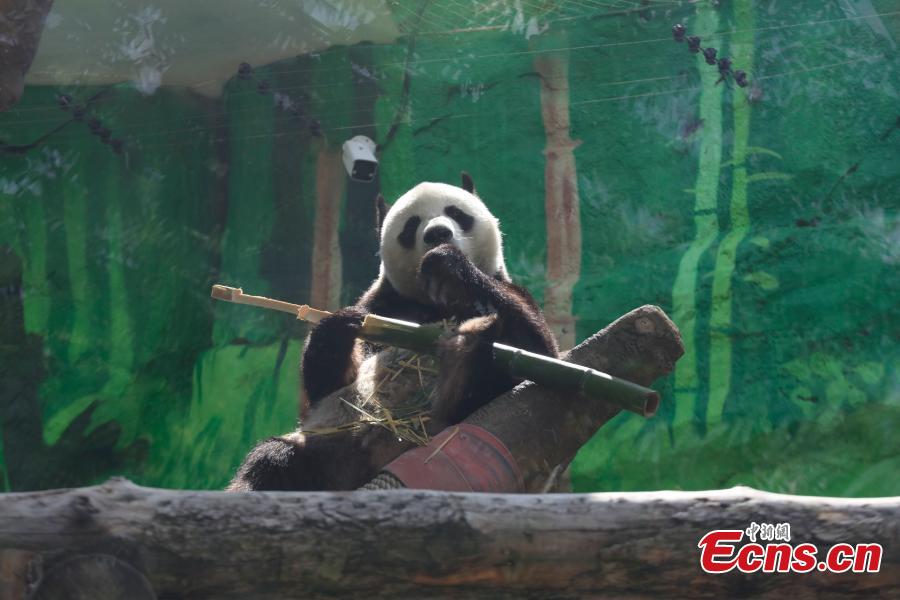 Giant panda Ru Yi eats bamboo during a birthday party at the Moscow Zoo in Russia, July 30, 2023. (Photo: China News Service/Tian Bing)