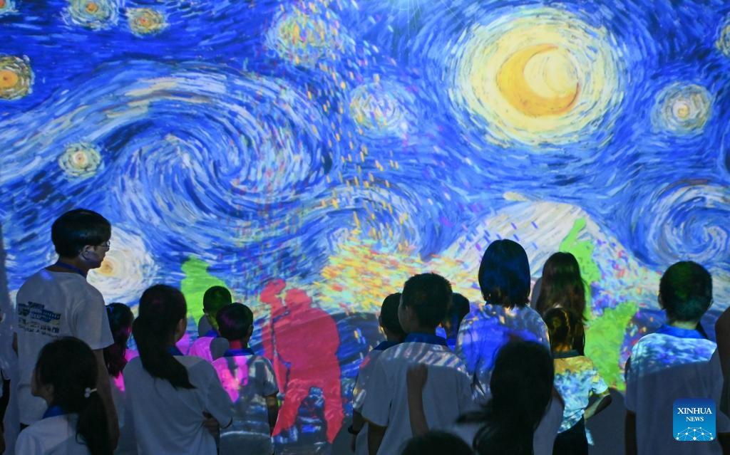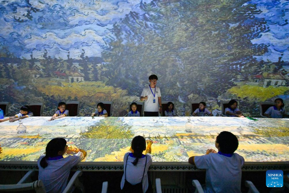 Students watch an immersive show of an artwork at the Tianjin Digital Art Museum in Tianjin, north China, July 30, 2023. During the summer vacation, the National Maritime Museum of China and the Tianjin Digital Art Museum jointly offered students with a study camp themed on ocean and art. Altogether 22 students from Beijing, Tianjin and Hebei Province learnt knowledge of ocean and nature and got in touch with digital art during the camp. (Xinhua/Sun Fanyue)