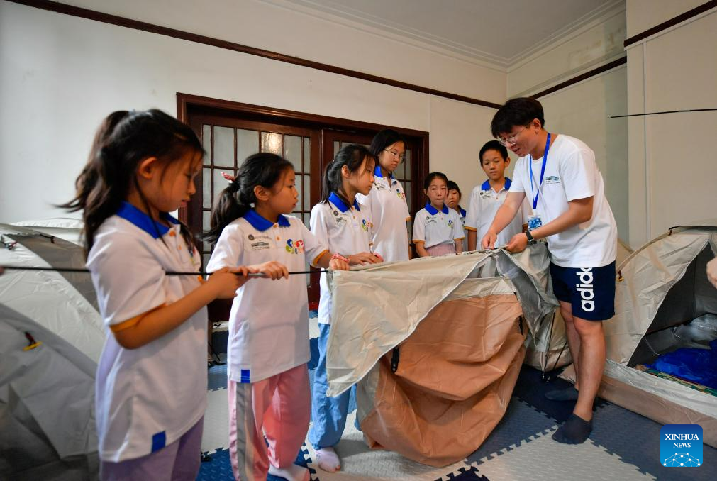 Students learn to set up a tent in the guidance of a teacher at the Tianjin Digital Art Museum in Tianjin, north China, July 30, 2023. During the summer vacation, the National Maritime Museum of China and the Tianjin Digital Art Museum jointly offered students with a study camp themed on ocean and art. Altogether 22 students from Beijing, Tianjin and Hebei Province learnt knowledge of ocean and nature and got in touch with digital art during the camp. (Xinhua/Sun Fanyue)