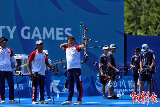 An athlete from China's archery team competes in the men's compound archery team final at the 31st FISU World University Games in Chengdu, southwest China's Sichuan Province, on July 30, 2023. (China Youth Daily/Zhao Di)
