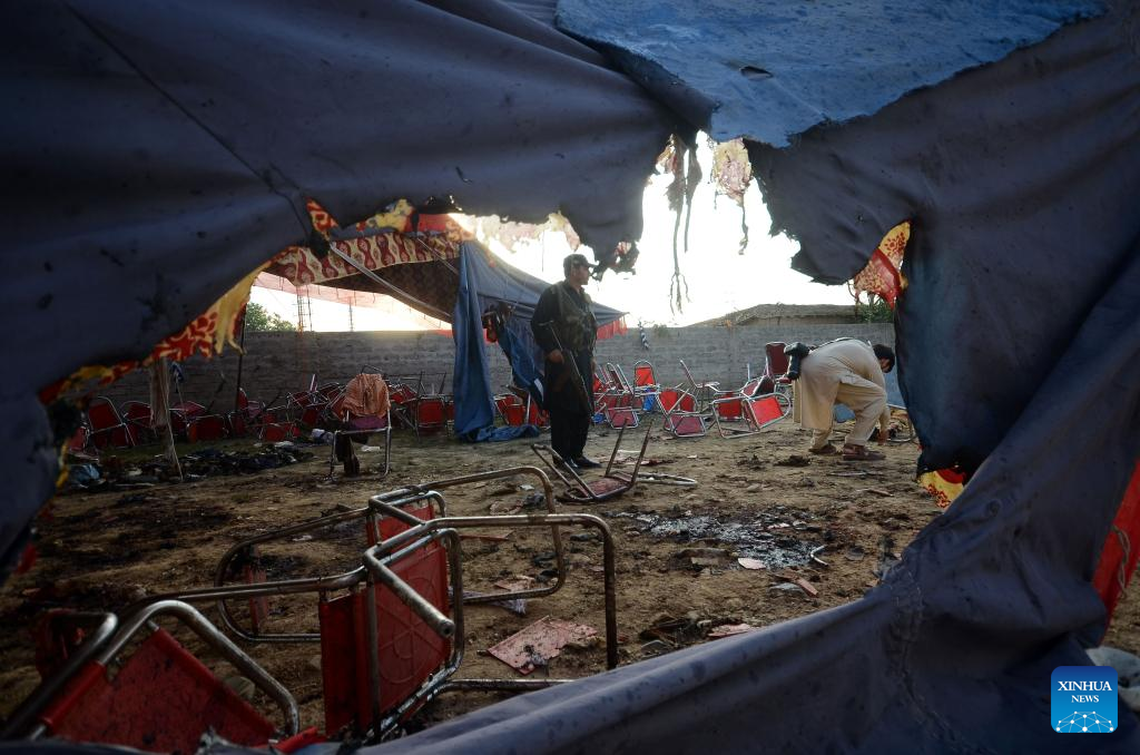 Security personnel inspect the site of a suicide attack in Bajaur district, Khyber Pakhtunkhwa province, northwestern Pakistan, on July 31, 2023. (Str/Xinhua)