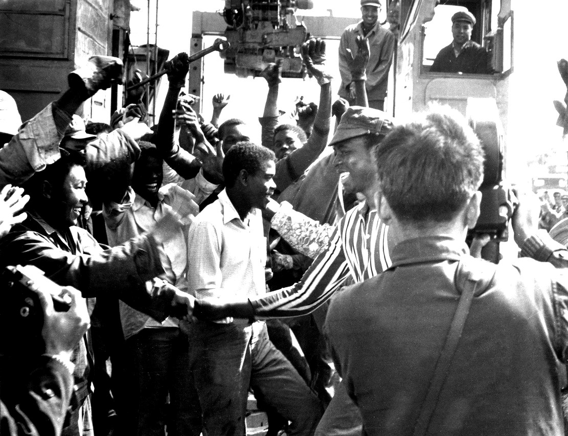 Constructors of the Dar es Salaam-Mlimba section of the Tanzania-Zambia Railway celebrate the completion of the section's track laying in Tanzania, Nov. 8, 1971. (Photo provided by the East Africa branch of China Civil Engineering Construction Corporation)