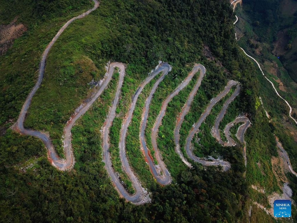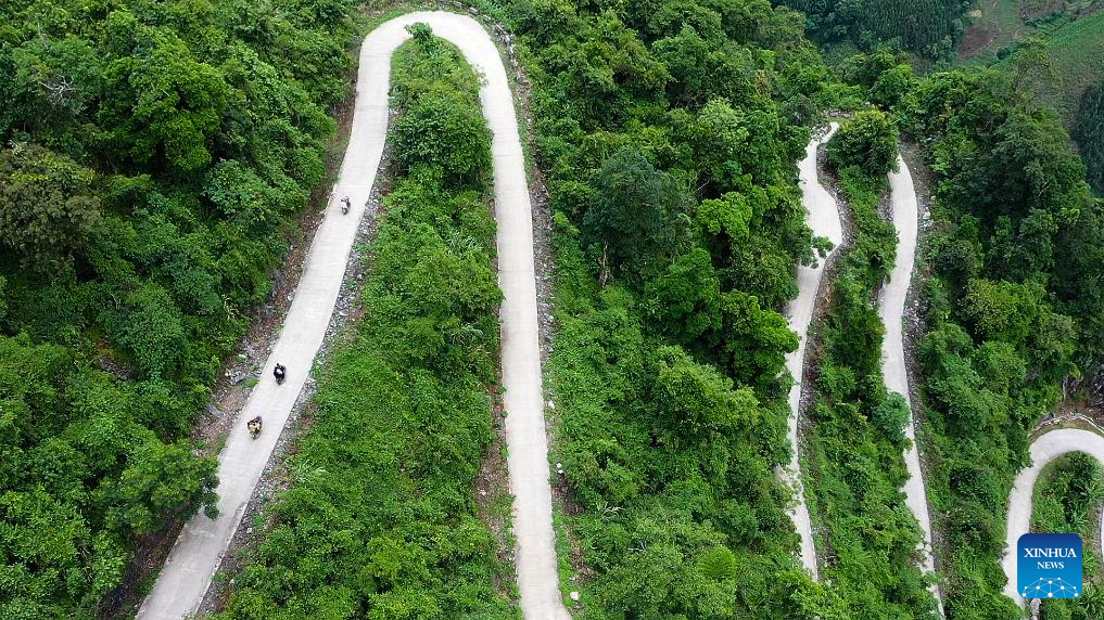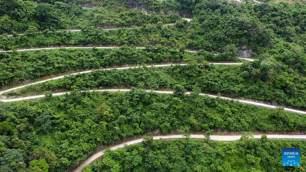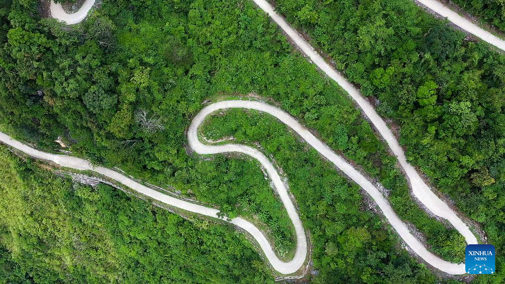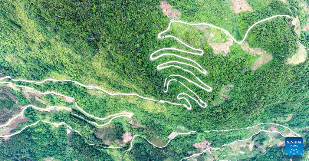 This aerial photo taken on July 31, 2023 shows a winding mountain road in Napo County, south China's Guangxi Zhuang Autonomous Region. Napo County belongs to the mountainous areas of Guangxi. In recent years, several winding mountain roads have been built to make it more convenient for local villagers to travel and to promote local economic growth at the same time. (Xinhua/Zhang Ailin)