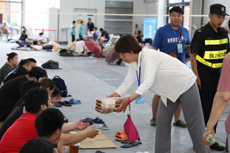 A worker hands out lunches at a temporary shelter in Shougang Park on Aug 1, 2023. [Photo by Wu Xiaohui/chinadaily.com.cn]