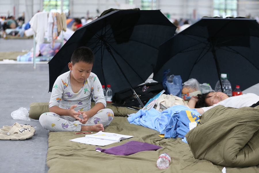A pupil studies at a temporary shelter in Shougang Park on Aug 1, 2023. [Photo by Wu Xiaohui/chinadaily.com.cn]