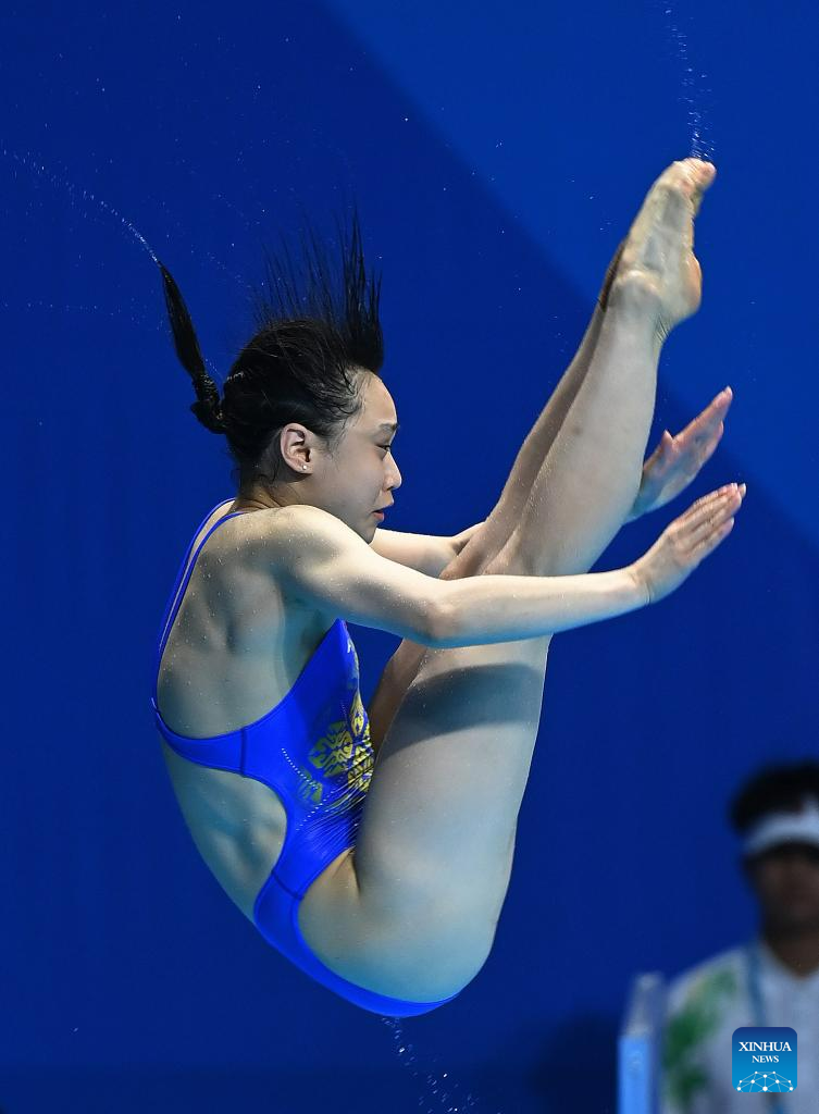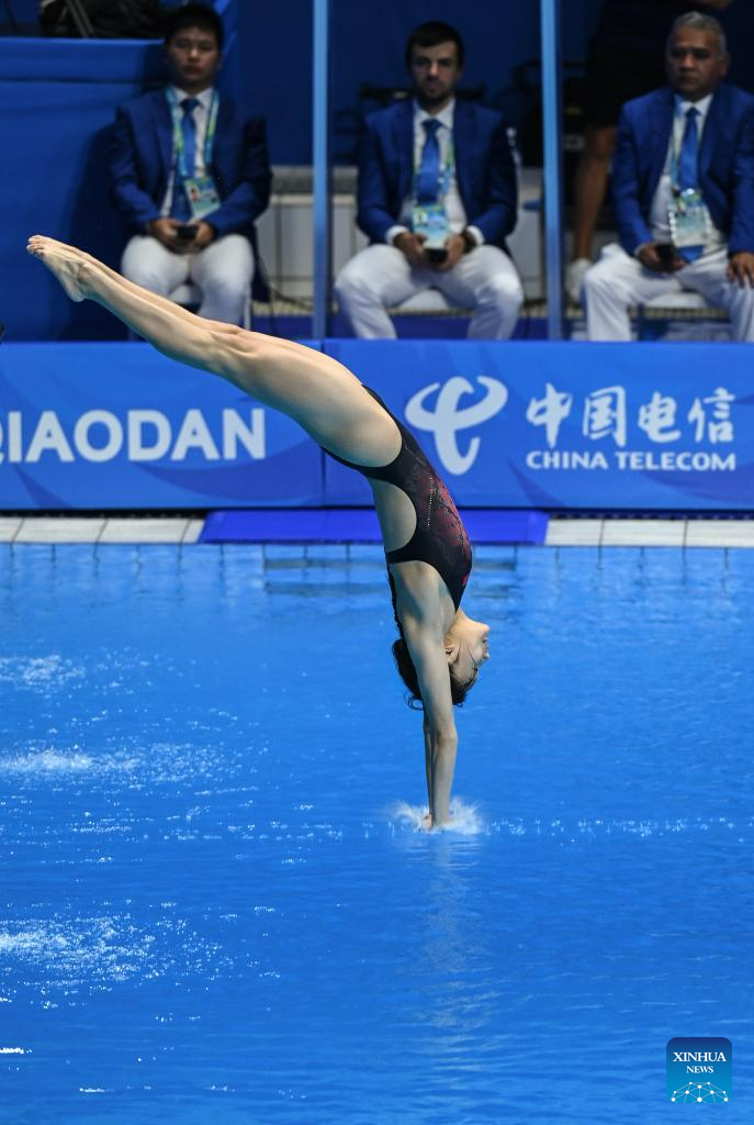 Chen Jia of China competes during the diving women's 1m springboard final at the 31st FISU Summer World University Games in Chengdu, southwest China's Sichuan Province, Aug. 1, 2023. (Xinhua/Liu Kun)
