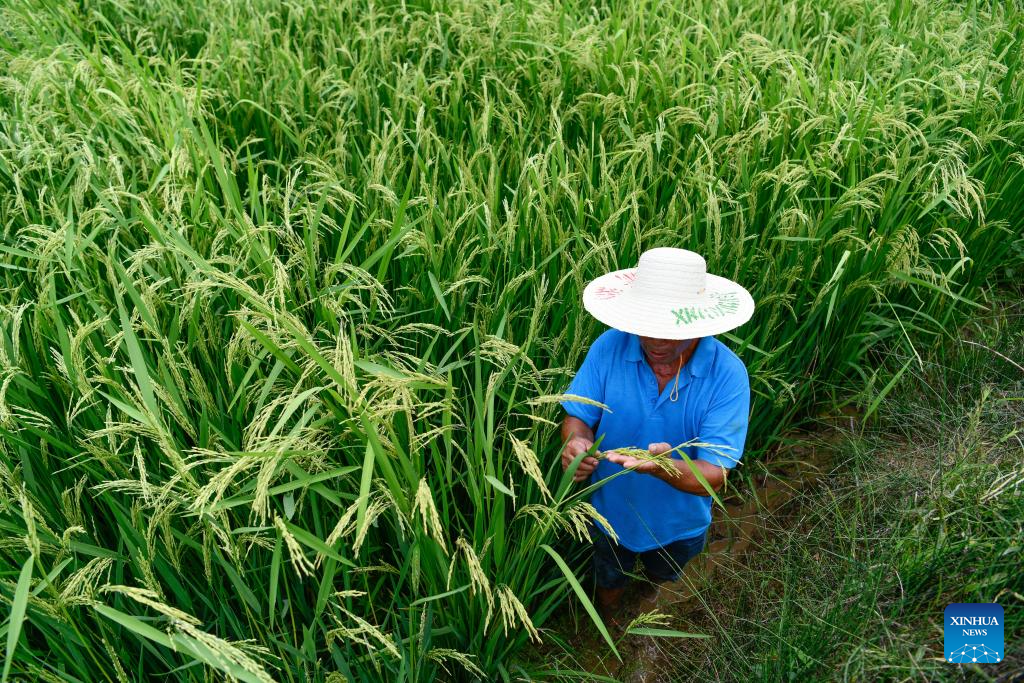 A farmer checks the condition of rice seedlings at the hybrid rice planting base in Xinchang Village of Cengong County in southwest China's Guizhou Province, Aug. 1, 2023. Cengong is a major rice-growing county in China with an annual yield of over 8 million kilograms of certified seeds. (Xinhua/Yang Wenbin)