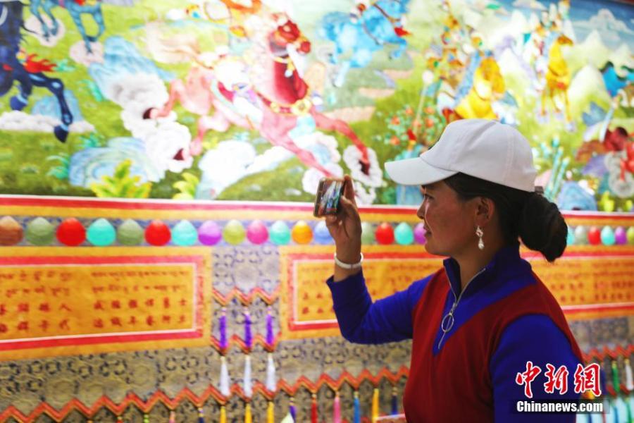 A visitor views Tibetan embroidery artworks displayed at a workshop in Hainan Tibetan Autonomous Prefecture, southeastern Qinghai Province, Aug. 1, 2023. (Photo: China News Service/Xue Di)