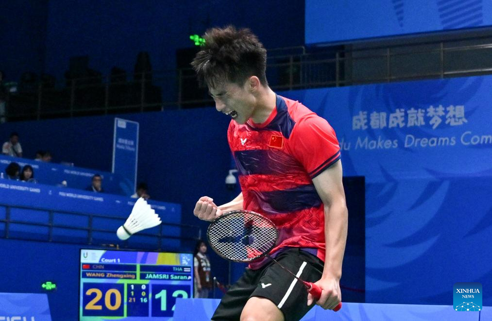 Wang Zhengxing of China reacts during the men's singles match against Saran Jamsri of Thailand in the Badminton Mixed Team Semifinal match between team China and team Thailand at the 31st FISU Summer World University Games in Chengdu, southwest China's Sichuan Province, Aug. 2, 2023. (Xinhua/Jigme Dorji)