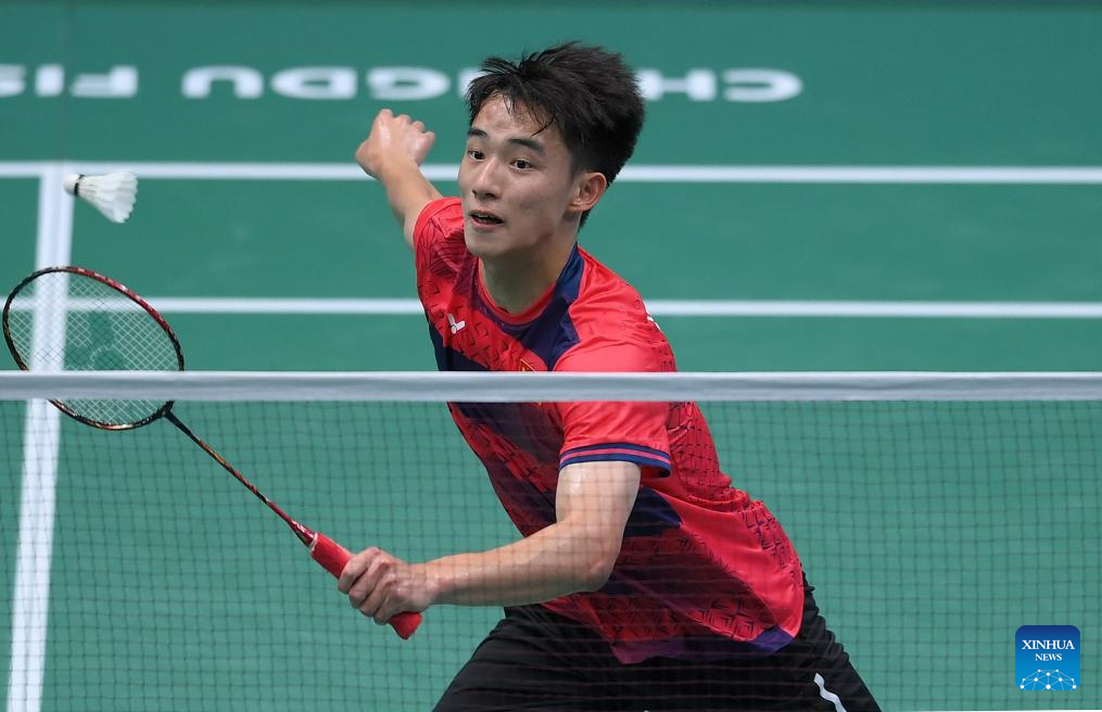 Wang Zhengxing of China competes during the men's singles match against Saran Jamsri of Thailand in the Badminton Mixed Team Semifinal match between team China and team Thailand at the 31st FISU Summer World University Games in Chengdu, southwest China's Sichuan Province, Aug. 2, 2023. (Xinhua/Jigme Dorji)