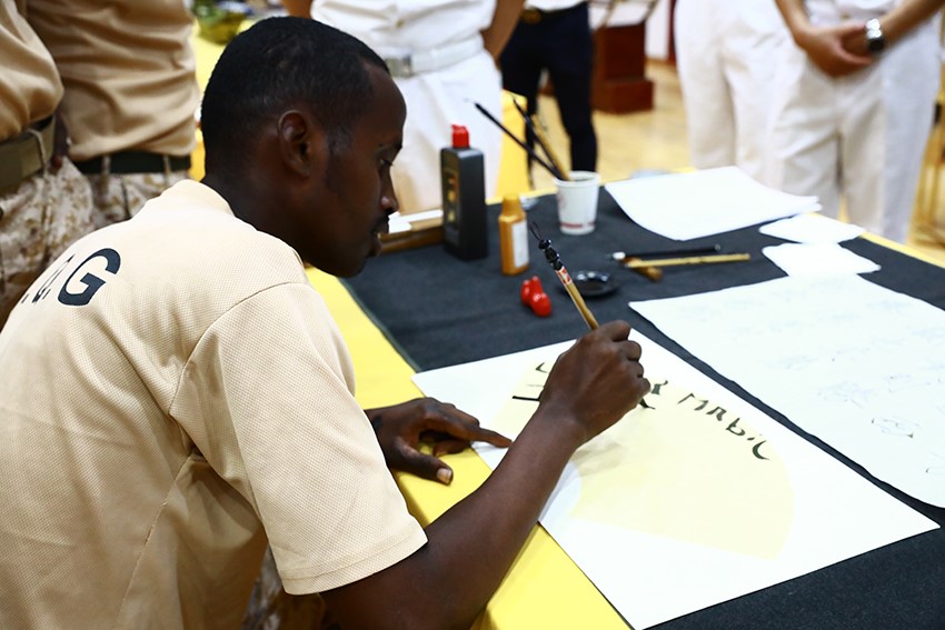 A foreign soldier tries Chinese calligraphy at an activity held to mark the 96th anniversary of the founding of the Chinese People's Liberation Army (PLA) and the sixth anniversary of the establishment of the PLA Support Base in Djibouti. (Photo/People's Daily Online)