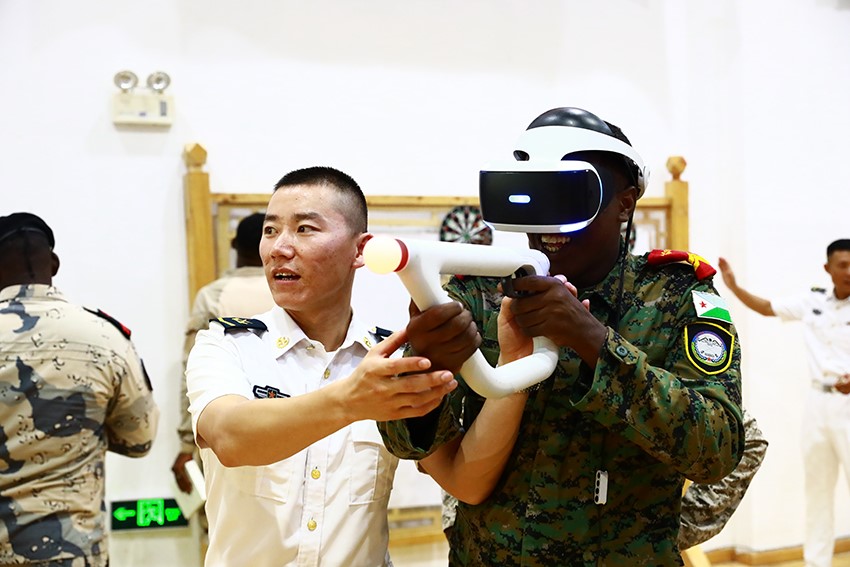 A foreign soldier enjoys a game with a virtual reality device at an activity held to mark the 96th anniversary of the founding of the Chinese People's Liberation Army (PLA) and the sixth anniversary of the establishment of the PLA Support Base in Djibouti. (Photo/People's Daily Online)