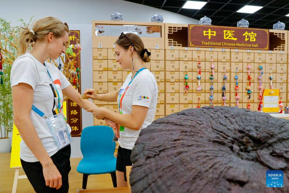 Members of the Austian deligation experience Guasha, or scraping treatment, at the Village of the 31st FISU Summer World University Games in Chengdu, southwest China's Sichuan Province, July 31, 2023. (Xinhua/Shen Bohan)